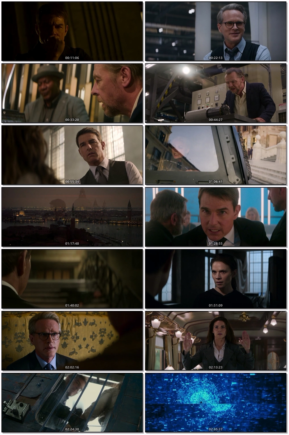 Cast: Tom Cruise as Ethan Hunt, Hayley Atwell as Grace, Ving Rhames as Luther Stickell, Simon Pegg as Benji Dunn, Rebecca Ferguson as Ilsa Faust, Vanessa Kirby as The White Widow, Esai Morales as Gabriel, Pom Klementieff as Paris, Henry Czerny as Kittridge, Shea Whigham as Briggs, Greg Tarzan Davis as Degas, Frederick Schmidt as Zola, Mariela Garriga as Marie, Cary Elwes as Denlinger, Charles Parnell as NRO, Mark Gatiss as NSA, Indira Varma as DIA, Rob Delaney as JSOC, Marcello Walton as Masked Adjutant, Brian Law as Adjutant, Lincoln Conway as Adjutant, Alex James-Phelps as India Zulu 254, Marcin Dorociński as Captain, Ivan Ivashkin as Executive Officer, Zahari Baharov as Deck Officer, Adrian Bouchet as Weapons Officer, Sam Barrett as Helmsman, Louis Vaughan as Chief Sonarman, Jean Kartal as Sonarman, Os Leanse as Sonarman, Luke Smith as Chief, Nikolaos Brahimllari as Diving Officer, Matt Malecki as Stern Plane Officer, Damian Rozanek as Galley Seaman, Antonio Bustorff as Sailor, Ioachim Ciobanu as Sailor, Michael Kosterin as Sailor, Sergej Lopouchanski as Sailor, Robert Luckay as Sailor, Jadran Malkovich as Sailor, Mikhail Safronov as Sailor, Christopher Sciueref as The Buyer, Andrea Scarduzio as The Wrong Man, Barnaby Kay as Put-Pocket Passenger, Gloria Obianyo as Osprey Agent, Alex Brock as Osprey Agent, Kaye Dinauto as Ticket Agent, Dana Blacklake as Foreign Agent, Arevinth V Sarma as Foreign Agent, Doroteya Toleva as Foreign Agent, Lucia Tong as Foreign Agent, Hersha Verity as Foreign Agent, Yennis Cheung as Airport Retail Employee, Laura Vortler as Bounty Hunter, Faycal Attougui as Bounty Hunter, Gaetano Bruno as Magistrate, Marco Sincini as Asst. Magistrate, Evita Ciri as Tourist, Melissa Anna Bartolini as Tourist, John Akanmu as Widow's Bodyguard, Marco Lascari as Gala Security, Simon Rizzoni as Gala Security, Nicolas Wang as Gala Security, Lee Bridgman as Dancer, Daniella Carraturo as Dancer, Katie Collins as Dancer, Joanna Dyce as Dancer, Taylor Goodridge as Dancer, Jessica Holland as Dancer, Philip Hulford as Dancer, Grace Jabbari as Dancer, Ira Mandela Siobhan as Dancer, Nicholas Tredrea as Dancer, Megan Westpfel as Dancer, Marc Wesley DeHaney as Luther Picture Double, Rocky Taylor as Orient Express Train Driver (uncredited)